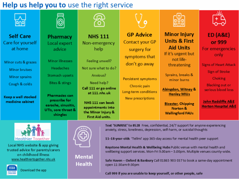 Minor Injury Unit, Abingdon: walk in or contact NHS 111. Open 10am-10.30pm daily.